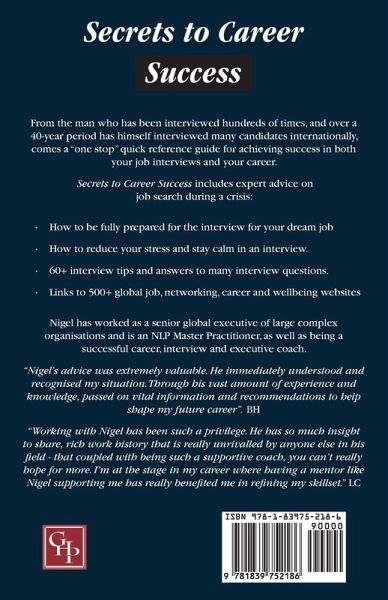 From the man who has been interviewed hundreds of times, and over a 40-year period has himself interviewed many candidates internationally, comes a "one stop" quick reference guide for achieving success in both your job interviews and your career. Secrets to Career Success includes expert advice on job search during a crisis: How to be fully prepared for the interview for your dream job How to reduce your stress and stay calm in an interview. 60+ interview tips and answers to many interview questions. Links to 500+ global job, networking, career and wellbeing websites. Nigel has worked as a senior global executive of large complex organisations and is an NLP Master Practitioner, as well as being a successful career, interview and executive coach. "Nigel's advice was extremely valuable. He immediately understood and recognised my situation. Through his vast amount of experience and knowledge, passed on vital information and recommendations to help shape my future career". BH "Working with Nigel has been such a privilege. He has so much insight to share, rich work history that is really unrivalled by anyone else in his field - that coupled with being such a supportive coach, you can't really hope for more. I'm at the stage in my career where having a mentor like Nigel supporting me has really benefited me in refining my skillset." LC