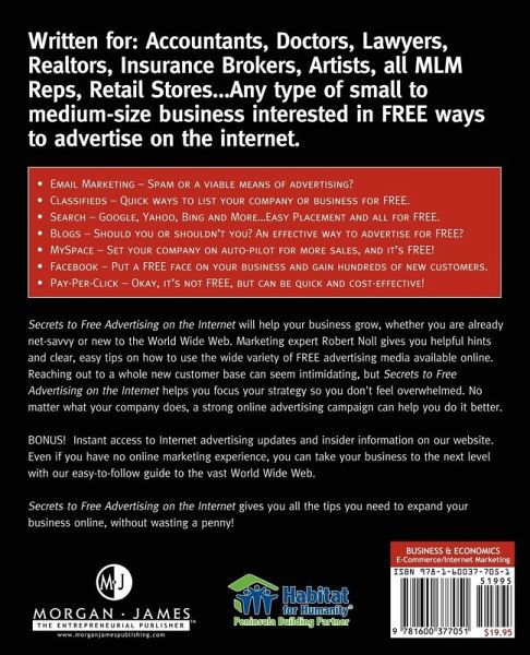 Written for: Accountants, Doctors, Lawyers, Realtors, Insurance Brokers, Artists, all MLM Reps, Retail Stores...Any type of small to medium-size business interested in FREE ways to advertise on the internet. Email Marketing - Spam or a viable means of advertising? Classifieds - Quick ways to list your company or business for FREE. Search - Google, Yahoo, Bing and More...Easy Placement and all for FREE. Blogs - Should you or shouldn't you??An effective way to advertise for FREE? MySpace - Set your company on auto-pilot for more sales, and it's FREE! Facebook - Put a FREE face on your business and gain hundreds of new customers. Pay-Per-Click - Okay, it's not FREE, but can be quick and cost-effective! Secrets to Free Advertising on the Internet will help your business grow, whether you are already net-savvy or new to the World Wide Web. Marketing expert Robert Noll gives you helpful hints and clear, easy tips on how to use the wide variety of FREE advertising media available online. Reaching out to a whole new customer base can seem intimidating, but Secrets to Free Advertising on the Internet helps you focus your strategy so you don't feel overwhelmed. No matter what your company does, a strong online advertising campaign can help you do it better.
