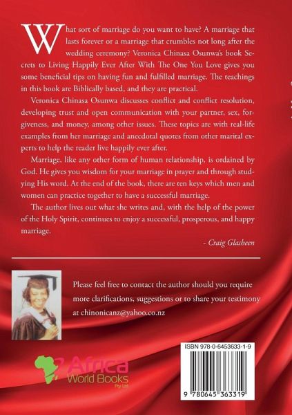 What sort of marriage do you want to have? A marriage that lasts forever or a marriage that crumbles not long after the wedding ceremony. Veronica Chinasa Osunwa's book Secrets to Living Happily Ever After with The One You Love gives you some beneficial tips on having fun and fulfilled marriage. The teachings in this book are Biblically based, and they are practical. Veronica Chinasa Osunwa discusses conflict and conflict resolution, developing trust and open communication with your partner, sex, for[1]givenness, and money, among other issues. These topics are with real-life examples from her marriage and anecdotal quotes from other marital experts to help the reader live happily ever after. Marriage, like any other form of human relationship, is ordained by God. He gives you wisdom for your marriage in prayer and through studying His word. At the end of the book, there are ten keys which men and women can practice together to have a successful marriage. The author lives out what she writes and, with the help of the power of the Holy Spirit, continues to enjoy a successful, prosperous, and happy marriage. - Craig Glasheen Please feel free to contact the author should you require more clarifications, suggestions or to share your testimony at chinonicanz@yahoo.co.n