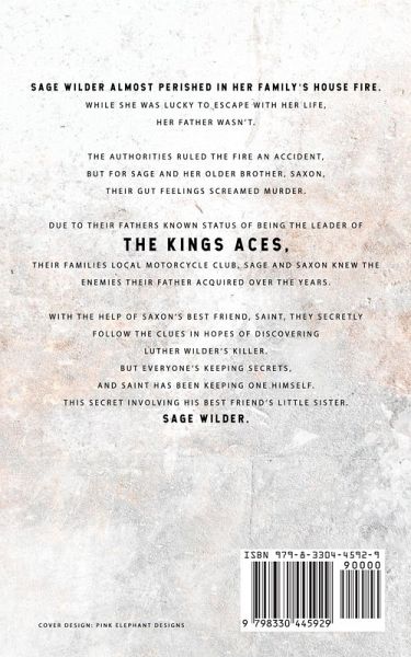 Sage Wilder almost perished in her family's house fire. While she was lucky to escape with her life, her father wasn't. Authorities ruled the fire an accident, but for Sage and her older brother, Saxon, their gut feelings screamed murder. Due to their father's known status of being the leader of The Kings Aces, their families local motorcycle club, Sage and Saxon knew the enemies their father acquired over the years. With the help of Saxon's best friend, Saint, they secretly follow the clues in hopes of discovering Luther Wilder's killer. But everyone's keeping secrets, and Saint has been keeping one himself. This Secret involving his best friend's little sister. Sage Wilder.
