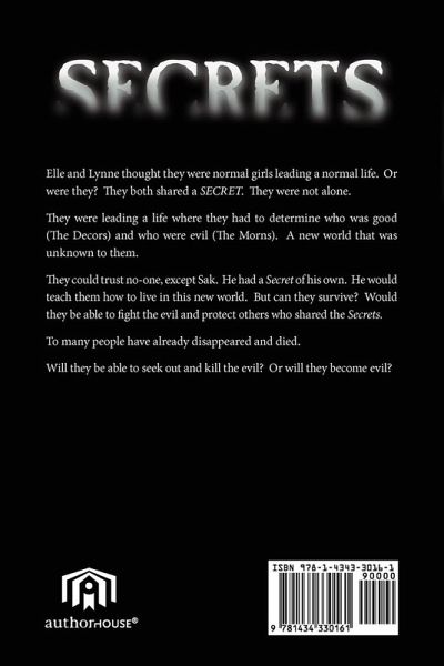 Elle and Lynne thought they were normal girls leading a normal life. Or were they? They both shared a SECRET. They were not alone. They were leading a life where they had to determine who was good( The Decors) and who were the evil(The Morns). A new world that was unknown to them. They could trust no-one, except Sak. He had a Secret of his own. He would teach them how to live in this new world. But can they survive? Would they be able to fight the evil and protect others who shared the Secrets. To many people have already disappeared and died. Will they be able to seek out and kill the evil? Or will they become evil?