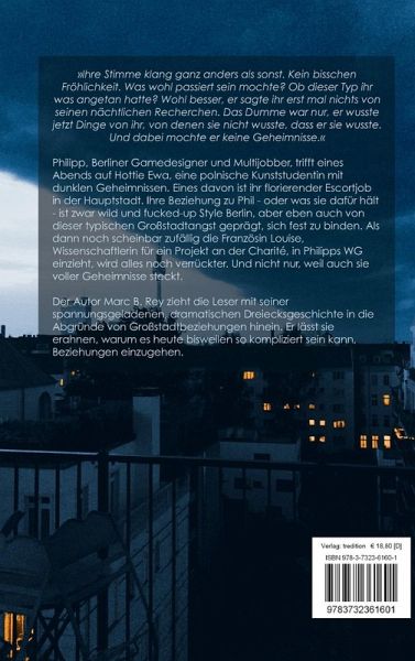 Der Autor Marc B. Rey zieht die Lesermit seiner spannungsgeladenen, dramatischen Dreiecksgeschichte in die Abgründe von Großstadtbeziehungen hinein. Er lässt sie erahnen, warum es heute bisweilen so kompliziert sein kann, Beziehungen einzugehen.