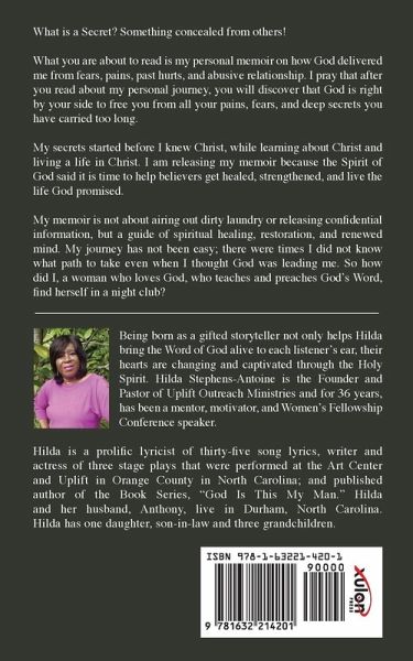 What is a Secret? Something concealed from others! What you are about to read is my personal memoir on how God delivered me from fears, pains, past hurts, and abusive relationship. I pray that after you read about my personal journey, you will discover that God is right by your side to free you from all your pains, fears, and deep secrets you have carried too long. My secrets started before I knew Christ, while learning about Christ and living a life in Christ. I am releasing my memoir because the Spirit of God said it is time to help believers get healed, strengthened, and live the life God promised. My memoir is not about airing out dirty laundry or releasing confidential information, but a guide of spiritual healing, restoration, and renewed mind. My journey has not been easy; there were times I did not know what path to take even when I thought God was leading me. So how did I, a woman who loves God, who teaches and preaches God's Word, find herself in a night club? Being born as a gifted storyteller not only helps Hilda bring the Word of God alive to each listener's ear, their hearts are changing and captivated through the Holy Spirit. Hilda Stephens-Antoine is the Founder and Pastor of Uplift Outreach Ministries and for 36 years, has been a mentor, motivator, and Women's Fellowship Conference speaker. Hilda is a prolific lyricist of thirty-five song lyrics, writer and actress of three stage plays that were performed at the Art Center and Uplift in Orange County in North Carolina; and published author of the Book Series, "God Is This My Man." Hilda and her husband, Anthony, live in Durham, North Carolina. Hilda has one daughter, son-in-law and three grandchildren.