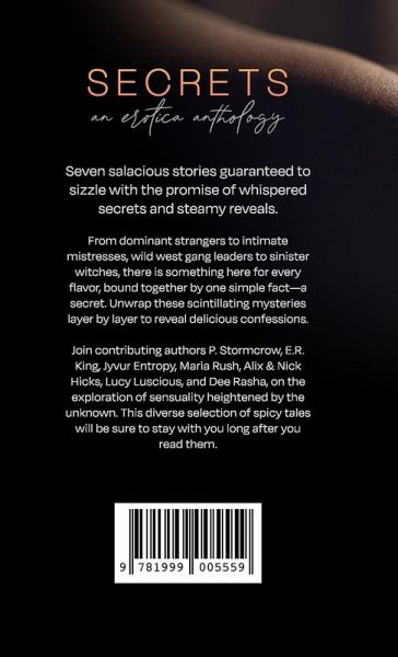 Seven salacious stories guaranteed to sizzle with the promise of whispered secrets and steamy reveals. From dominant strangers to intimate mistresses, wild west gang leaders to sinister witches, there is something here for every flavor, bound together by one simple fact-a secret. Unwrap these scintillating mysteries layer by layer to reveal delicious confessions. Join contributing authors P. Stormcrow, E.R. King, Jyvur Entropy, Maria Rush, Alix & Nick Hicks, Lucy Luscious, and Dee Rasha, on the exploration of sensuality heightened by the unknown. This diverse selection of spicy tales will be sure to stay with you long after you read them.