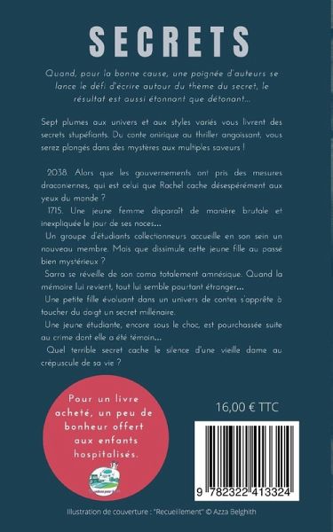 Quand, pour la bonne cause, une poignée d'auteurs se lance le défi d'écrire autour du thème du secret, le résultat est aussi étonnant que détonant... Sept plumes aux univers et aux styles variés vous livrent des secrets stupéfiants. Du conte onirique au thriller angoissant, vous serez plongés dans des mystères aux multiples saveurs ! 1715. Une jeune femme disparaît de manière brutale et inexpliquée le jour de ses noces... Quel terrible secret cache le silence d'une vieille dame au crépuscule de sa vie ? Une jeune étudiante, encore sous le choc, est pourchassée suite au crime dont elle a été témoin... 2038. Alors que les gouvernements ont pris des mesures draconiennes, qui est celui que Rachel cache désespérément aux yeux du monde ? Une petite fille évoluant dans un univers de contes s'apprête à toucher du doigt un secret millénaire. Sarra se réveille de son coma totalement amnésique. Quand la mémoire lui revient, tout lui semble pourtant étranger... Un groupe d'étudiants collectionneurs accueille en son sein un nouveau membre. Mais que dissimule cette jeune fille au passé bien mystérieux ? Secrets de famille, intrigues haletantes, mystères et sombres destinées sont les ingrédients explosifs de ce recueil de nouvelles aux rebondissements inattendus.