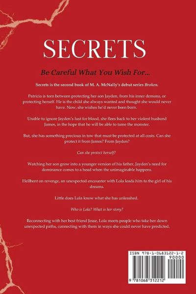 Secrets is the second book of M. A. McNally's debut series Broken. Patricia is torn between protecting her son Jayden, from his inner demons, or protecting herself. He is the child she always wanted and thought she would never have. Now, she wishes he'd never been born. Unable to ignore Jayden's lust for blood, she flees back to her violent husband James in the hope that he will be able to tame the monster. But, she has something precious in tow that must be protected at all costs. Can she protect it from James? From Jayden? Can she protect herself? Watching her son grow into a younger version of his father, Jayden's need for dominance comes to a head when the unimaginable happens. Hellbent on revenge, an unexpected encounter with Lola leads him to the girl of his dreams. Little does Lola know what she has unleashed. Who is Lola? What is her story? Reconnecting with her best friend Jesse, Lola meets people who take her down unexpected paths, connecting with them in ways she could never have predicted.