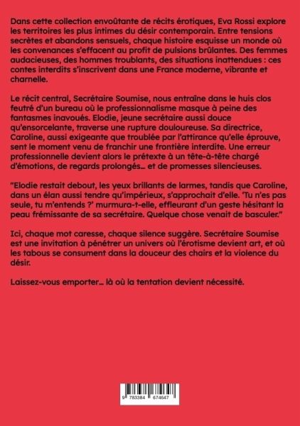 Dans cette collection envoûtante de récits érotiques, Eva Rossi explore les territoires les plus intimes du désir contemporain. Entre tensions secrètes et abandons sensuels, chaque histoire esquisse un monde où les convenances s'effacent au profit de pulsions brûlantes. Des femmes audacieuses, des hommes troublants, des situations inattendues : ces contes interdits s'inscrivent dans une France moderne, vibrante et charnelle.Le récit central, Secrétaire Soumise, nous entraîne dans le huis clos feutré d'un bureau où le professionnalisme masque à peine des fantasmes inavoués. Elodie, jeune secrétaire aussi douce qu'ensorcelante, traverse une rupture douloureuse. Sa directrice, Caroline, aussi exigeante que troublée par l'attirance qu'elle éprouve, sent le moment venu de franchir une frontière interdite. Une erreur professionnelle devient alors le prétexte à un tête-à-tête chargé d'émotions, de regards prolongés... et de promesses silencieuses."Elodie restait debout, les yeux brillants de larmes, tandis que Caroline, dans un élan aussi tendre qu'impérieux, s'approchait d'elle. 'Tu n'es pas seule, tu m'entends ?' murmura-t-elle, effleurant d'un geste hésitant la peau frémissante de sa secrétaire. Quelque chose venait de basculer."Ici, chaque mot caresse, chaque silence suggère. Secrétaire Soumise est une invitation à pénétrer un univers où l'érotisme devient art, et où les tabous se consument dans la douceur des chairs et la violence du désir.Laissez-vous emporter... là où la tentation devient nécessité.