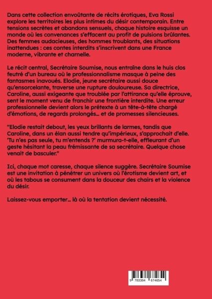 Dans cette collection envoûtante de récits érotiques, Eva Rossi explore les territoires les plus intimes du désir contemporain. Entre tensions secrètes et abandons sensuels, chaque histoire esquisse un monde où les convenances s'effacent au profit de pulsions brûlantes. Des femmes audacieuses, des hommes troublants, des situations inattendues : ces contes interdits s'inscrivent dans une France moderne, vibrante et charnelle.Le récit central, Secrétaire Soumise, nous entraîne dans le huis clos feutré d'un bureau où le professionnalisme masque à peine des fantasmes inavoués. Elodie, jeune secrétaire aussi douce qu'ensorcelante, traverse une rupture douloureuse. Sa directrice, Caroline, aussi exigeante que troublée par l'attirance qu'elle éprouve, sent le moment venu de franchir une frontière interdite. Une erreur professionnelle devient alors le prétexte à un tête-à-tête chargé d'émotions, de regards prolongés... et de promesses silencieuses."Elodie restait debout, les yeux brillants de larmes, tandis que Caroline, dans un élan aussi tendre qu'impérieux, s'approchait d'elle. 'Tu n'es pas seule, tu m'entends ?' murmura-t-elle, effleurant d'un geste hésitant la peau frémissante de sa secrétaire. Quelque chose venait de basculer."Ici, chaque mot caresse, chaque silence suggère. Secrétaire Soumise est une invitation à pénétrer un univers où l'érotisme devient art, et où les tabous se consument dans la douceur des chairs et la violence du désir.Laissez-vous emporter... là où la tentation devient nécessité.