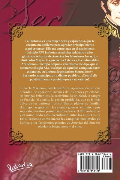 La Historia, es una mujer bella y caprichosa, que le encanta maquillarse para agradar principalmente a gobernantes. Ella me cont, que en el nacimiento del siglo XVI las botas espaolas aplastaron a los gloriosos Seoros de Amrica: los laboriosos Incas, los ilustrados Mayas, los guerreros Aztecas y los indomables Araucanos... Tiempo despes, ella misma me dijo, que al asomarse el siglo XIX, los hijos de aquellos conquistadores espaoles, tres hroes legendarios: Simn, Jos y Bernardo, emanciparon a dichos pueblos... Cmo! Es posible liberar a pueblos que ya no existen?. En Secta Mariposa, novela histrica, aparecen, en estricto desorden de aparicin, adems de los hroes ya citados: las intrigas britnicas, la esclavitud, la crueldad, la sangre de Francia, el abuelo, la pasin prohibida, que es la ms dulce de las pasiones, los cotidianos pleitos de familia, el amigo, las guerras... las eternas guerras, el nieto, y por supuesto, nuestros primersimos actores: el Romanticismo y el Amor. Todo esto, escenificado entre los aos 1749 y 1836. Teniendo como marco las campias medievales de Europa y los fascinantes paisajes de Amrica del Sur; sin olvidar la buena mesa y el vino.