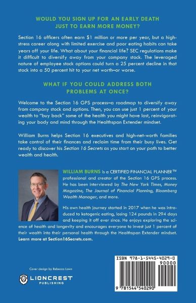 Would you sign up for an early death just to earn more money? Section 16 officers often earn $1 million or more per year, but a high-stress career along with limited exercise and poor eating habits can take years off your life. What about your financial life? SEC regulations make it difficult to diversify away from your company stock. The leveraged nature of employee stock options could turn a 25 percent decline in that stock into a 50 percent hit to your net worth-or worse. What if you could address both problems at once? Welcome to the Section 16 GPS process-a roadmap to diversify away from company stock and options. Then, you can use just 1 percent of your wealth to "buy back" some of the health you might have lost, reinvigorating your body and mind through the Healthspan Extender mindset. William Burns helps Section 16 executives and high-net-worth families take control of their finances and reclaim time from their busy lives. Get ready to discover his Section 16 Secrets as you start on your path to better wealth and health.
