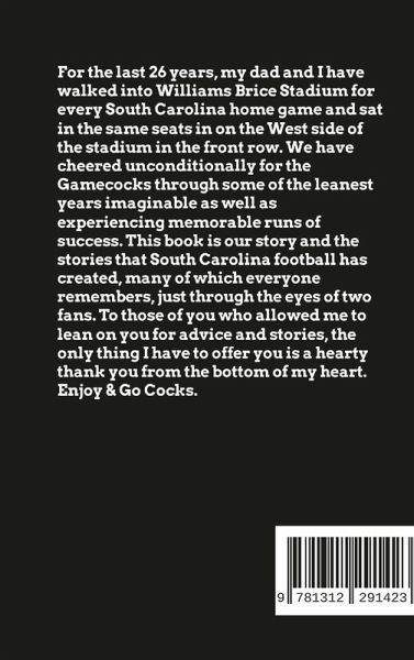 For the last 26 years, my dad and I have walked into Williams Brice Stadium for every South Carolina home game and sat in the same seats in on the West side of the stadium in the front row. We have cheered unconditionally for the Gamecocks through some of the leanest years imaginable as well as experiencing memorable runs of success. This book is our story and the stories that South Carolina football has created, many of which everyone remembers, just through the eyes of two fans. To those of you who allowed me to lean on you for advice and stories, the only thing I have to offer you is a hearty thank you from the bottom of my heart. Enjoy & Go Cocks.