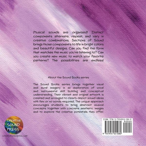 The Sound Books series is a picture book collection designed to visually represent musical concepts for young learners. Its original artwork is created and arranged to clearly depict sound ideas with few or no words required. The unique approach encourages students to bring together visual and aural imagery and creativity in an exploration of vocal and instrumental skill building and conceptual musical understanding. Designed for interactive use between parents and children, teachers and students, each book focuses on a particular skill and/or concept area and provides strategies for effective use. Sections of Sound is the second publication in the series and focuses on the organization of sounds in musical compositions. Elementary children and older students will find the content clear and effective in its representation of musical form in existing works and provide a creative structure with which to create their own music.