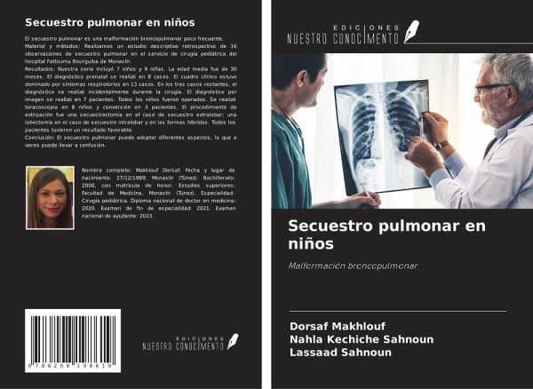 El secuestro pulmonar es una malformación broncopulmonar poco frecuente.Material y métodos: Realizamos un estudio descriptivo retrospectivo de 16 observaciones de secuestro pulmonar en el servicio de cirugía pediátrica del hospital Fattouma Bourguiba de Monastir.Resultados: Nuestra serie incluyó 7 niños y 9 niñas. La edad media fue de 30 meses. El diagnóstico prenatal se realizó en 8 casos. El cuadro clínico estuvo dominado por síntomas respiratorios en 13 casos. En los tres casos restantes, el diagnóstico se realizó incidentalmente durante la cirugía. El diagnóstico por imagen se realizó en 7 pacientes. Todos los niños fueron operados. Se realizó toracoscopia en 8 niños y conversión en 3 pacientes. El procedimiento de extirpación fue una secuestrectomía en el caso de secuestro extralobar; una lobectomía en el caso de secuestro intralobar y en las formas híbridas. Todos los pacientes tuvieron un resultado favorable.Conclusión: El secuestro pulmonar puede adoptar diferentes aspectos, lo que a veces puede llevar a confusión.