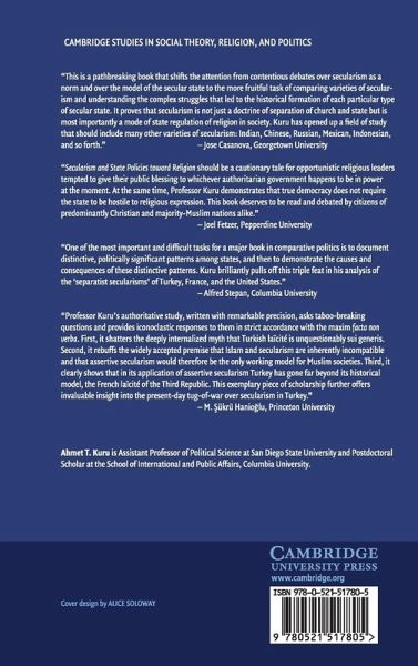 Why do secular states pursue different policies toward religion? This book provides a generalizable argument about the impact of ideological struggles on the public policy making process, as well as a state-religion regimes index of 197 countries. More specifically, it analyzes why American state policies are largely tolerant of religion, whereas French and Turkish policies generally prohibit its public visibility, as seen in their bans on Muslim headscarves. In the United States, the dominant ideology is 'passive secularism', which requires the state to play a passive role, by allowing public visibility of religion. Dominant ideology in France and Turkey is 'assertive secularism', which demands that the state play an assertive role in excluding religion from the public sphere. Passive and assertive secularism became dominant in these cases through certain historical processes, particularly the presence or absence of an ancien régime based on the marriage between monarchy and hegemonic religion during state-building periods.