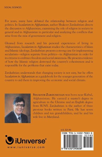 For years, many have debated the relationship between religion and politics. In Secularism in Afghanistan, author Shukoor Zardushtian directs the discussion to Afghanistan, examining the role of religion in society in general and in Afghanistan in particular and analyzing the conflicts that arise from the mix of government and religion. Gleaned from research and his personal experiences of living in Afghanistan, Secularism in Afghanistan studies the characteristics of Islam and Islamic ideology. Zardushtian presents a strong case for implementing secularism-religion separate from politics-in Afghanistan in order for its citizens to embrace freedom and social awareness. He presents evidence of how the Islamic religion destroyed the country's cohesiveness and is responsible for the problems that exist today. Zardushtian understands that changing society is not easy, but he offers Secularism in Afghanistan as a guidebook for the younger generation of the country to aid them in improving the economic and social climate.