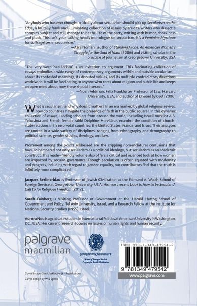 I. INTRODUCTION: SECULARISM ON THE EDGE Jacques Berlinerblau, Georgetown University II. PART ONE: CONTEMPORARY CHALLENGES TO AMERICAN SECULARISM 1. Is America a Christian nation or a secular nation?, John Fea and Jacques Berlinerblau 2. Let the study of American secularisms begin!, Jacques Berlinerblau 3. The United States Supreme Court's Religion Clause jurisprudence, Caroline Mala Corbin 4. The vitality of soft secularism in the United States and the rise of the 'nones", Barry Kosmin 5. Secular America: Atheists, agnostics, and the religiously unaffiliated, Phil Zuckerman and Jacques Berlinerblau III. PART TWO: HILONIYUT: CURRENT LEGAL AND SOCIAL ISSUES 6. A self-restrained secularism? Halakhah and Sharia in contemporary Israel, Denis Charbit 7. The 'status quo': Old and new frontlines between hilonim and anti-hiloni forces in Israel?, Ilan Greilsammer 8. Israeli religious secularism, Anita Shapira IV. PART THREE: LAICITE IN A CULTURAL FRANCE 9. Post-war French Jewry facing laïcité in a multicultural France, Régine Azria 10. Laïcité and freedom of conscience in pluricultural France, Jean Baubérot 11. Laïcité as a background of emancipation, Henri Pena-Ruiz V. PART FOUR: WOMEN AND SECULARISM: PROBLEMS AND POSSIBILITIES 12. Freedom of choice: Women and demography in Israel, France, and the United States, Ariela Keysar 13. In the eyes of patriarchal religion, all women are secular: What can we learn from this?, Susan Thistlethwaite 14. Religious divorce and civil divorce for Jewish and Muslim women in Canada: A comparative approach, Pascale Fournier VI. CONCLUSION: THE SECULAR PROSPECT, Sarah Fainberg and Aurora Nou