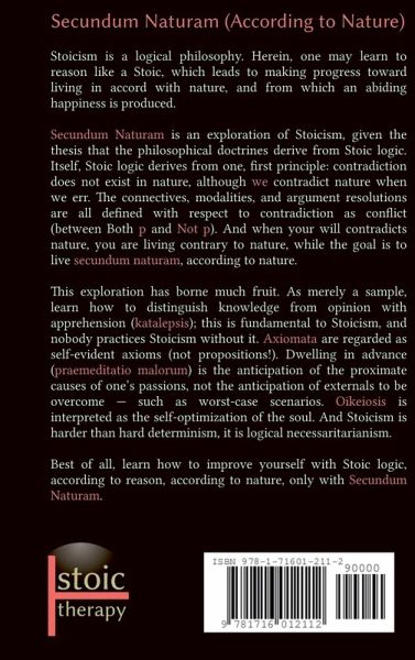 Stoicism is a logical philosophy. Herein, one may learn to reason like a Stoic, which leads to making progress toward living in accord with nature, and from which an abiding happiness is produced. Secundum Naturam is an exploration of Stoicism, given the thesis that the philosophical doctrines derive from Stoic logic. Itself, Stoic logic derives from one, first principle: contradiction does not exist in nature, although we contradict nature when we err. The connectives, modalities, and argument resolutions are all defined with respect to contradiction as conflict (between Both p and Not p). And when your will contradicts nature, you are living contrary to nature, while the goal is to live secundum naturam, according to nature. Best of all, learn how to improve yourself with Stoic logic, according to reason, according to nature, only with Secundum Naturam.