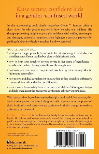 Raise secure, confident kids in a gender-confused world In this eye-opening book, family researcher Glenn T. Stanton offers a clear vision for why gender matters in how we raise our children. His thought-provoking insights expose the problems with stifling stereotypes and damaging cultural assumptions, then highlight a practical pathway for guiding children into healthy manhood and womanhood. You'll discover… · what gender-appropriate behavior looks like at various ages-and why you shouldn't panic if your toddler boy plays with his sister's dolls. · how to help your daughter become secure in her sense of significance-whether she prefers chasing butterflies or shooting hoops. · how to inspire your son to compete and take healthy risks-in ways that fit his unique personality. · how moms and dads complement one another as they discipline differently, comfort differently, and influence differently. · what you can do on a daily basis to nurture your children's God-given design and help them resist the pressure to conform to arbitrary cultural rules. With practical tools, well-researched insights, and real-life scenarios, this book equips parents to launch daughters who are secure in the power of their femininity and sons who are confident in their strength to make a difference in the world.
