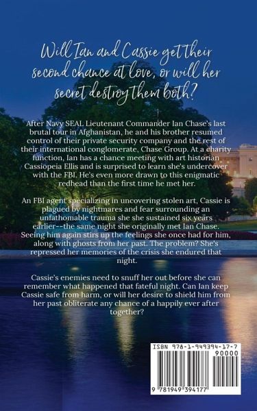 Will Ian and Cassie get their second chance at love, or will her secret destroy them both? After Navy SEAL Lieutenant Commander Ian Chase's last brutal tour in Afghanistan, he and his brother resumed control of their private security company and the rest of their international conglomerate, Chase Group. At a charity function, Ian has a chance meeting with art historian Cassiopeia Ellis and is surprised to learn she's undercover with the FBI. He's even more drawn to this enigmatic redhead than the first time he met her. An FBI agent specializing in uncovering stolen art, Cassie is plagued by nightmares and fear surrounding an unfathomable trauma she sustained six years earlier--the same night she originally met Ian Chase. Seeing him again stirs up the feelings she once had for him, along with ghosts from her past. The problem? She's repressed her memories of the crisis she endured that night. Cassie's enemies need to snuff her out before she can remember what happened that fateful night. Can Ian keep Cassie safe from harm, or will her desire to shield him from her past obliterate any chance of a happily ever after together?