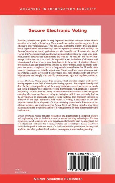 Secure Electronic Voting is an edited volume, which includes chapters authored by leading experts in the field of security and voting systems. The chapters identify and describe the given capabilities and the strong limitations, as well as the current trends and future perspectives of electronic voting technologies, with emphasis in security and privacy. Secure Electronic Voting includes state-of-the-art material on existing and emerging electronic and Internet voting technologies, which may eventually lead to the development of adequately secure e-voting systems. This book also includes an overview of the legal framework with respect to voting, a description of the user requirements for the development of a secure e-voting system, and a discussion on the relevant technical and social concerns. Secure Electronic Voting includes, also, three case studies on the use and evaluation of e-voting systems in three different real world environments.