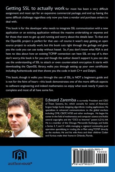 Getting SSL to actually work for most has been a very difficult assignment and most opt for an expensive commercial package, and end up having the same difficult challenge regardless only now you have a vendor and purchase orders to deal with. This book is for the developer who needs to integrate SSL communication with a new application or an existing application without the massive undertaking or expense and for those that want to get up and running and worry about the details later. To that end the OpenSSL project is perfect for that use-of course it wasn't easy getting an open source project to actually work, but this book cuts right through the garbage and gives you the code you can use today without hassel. So, if you don't know what RSA is and have no idea about how an existing TCP/IP connection can have SSL on top of it, then don't worry, this book is for you and though the author doesn't support it, you can also use the understanding of SSL to attack or even counter-attack encryption. It starts with downloading the OpenSSL library, walks you through setting up your own certificates including Authenticode and then shows you the code in both C++ and Delphi. This book, though it walks you through the use of SSL, is NOT a beginners guide and is not for the feint of heart-this book demonstrates one of the more difficult aspects to software engineering and indeed mathematics so enjoy what took nearly 4 years to complete and most of all have some fun.