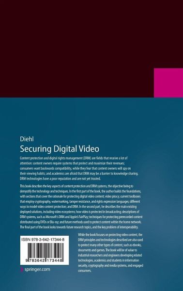 This book describes the key aspects of content protection and DRM systems, the objective being to demystify the technology and techniques. In the first part of the book, the author builds the foundations, with sections that cover the rationale for protecting digital video content; video piracy; current toolboxes that employ cryptography, watermarking, tamper resistance, and rights expression languages; different ways to model video content protection; and DRM. In the second part, he describes the main existing deployed solutions, including video ecosystems; how video is protected in broadcasting; descriptions of DRM systems, such as Microsoft's DRM and Apple's FairPlay; techniques for protecting prerecorded content distributed using DVDs or Blu-ray; and future methods used to protect content within the home network. The final part of the book looks towards future research topics, and the key problem of interoperability.