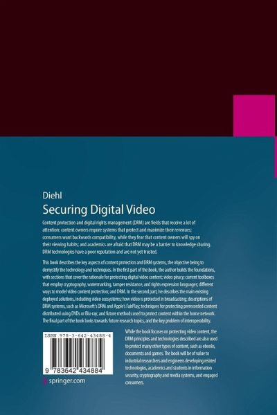 This book describes the key aspects of content protection and DRM systems, the objective being to demystify the technology and techniques. In the first part of the book, the author builds the foundations, with sections that cover the rationale for protecting digital video content; video piracy; current toolboxes that employ cryptography, watermarking, tamper resistance, and rights expression languages; different ways to model video content protection; and DRM. In the second part, he describes the main existing deployed solutions, including video ecosystems; how video is protected in broadcasting; descriptions of DRM systems, such as Microsoft's DRM and Apple's FairPlay; techniques for protecting prerecorded content distributed using DVDs or Blu-ray; and future methods used to protect content within the home network. The final part of the book looks towards future research topics, and the key problem of interoperability.