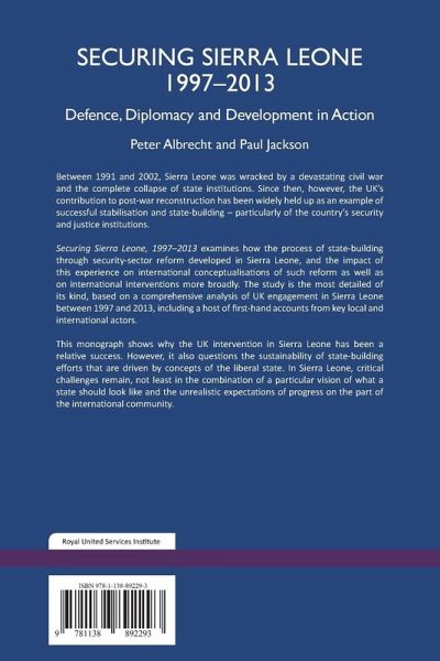 Between 1991¿and¿2002, Sierra Leone was wracked by a devastating civil war and the complete collapse of state institutions. Since then, however, the UK's contribution to post-war reconstruction has been widely held up as an example of successful stabilisation and state-building - particularly of the country's security and justice institutions.¿ Securing Sierra Leone, 1997-2013¿examines how the process of state-building through security-sector reform developed in Sierra Leone, and the impact of this experience on international conceptualisations of¿such¿reform as well as on international interventions more broadly. The study is the most detailed of its kind, based on a comprehensive analysis of UK engagement in Sierra Leone between 1997 and 2013, including a host of first-hand accounts from key local and international actors. This monograph shows why the UK intervention in Sierra Leone has been a relative success. However, it also questions the sustainability of state-building efforts that are driven by concepts of the liberal state. In Sierra Leone, critical challenges remain, not least in the combination of a particular vision of what a state should look like and¿the¿unrealistic expectations of progress on the part of the international community.