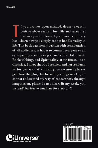 If you are not open-minded, down to earth, positive about realism, lust, life and sexuality; I advise you to please, by all means, put my book down now you simply cannot handle reality in life. This book was merely written with consideration of all audiences, in hopes to connect everyone to an eye-opening reading experience about Life, Lust, Backstabbing, and Spirituality at its finest...as a Christian, I know that God convicts and not condemn us for our way of thinking, so we must always give him the glory for his mercy and grace. If you cannot understand my way of connectivity through imagination, please do not discredit my work, yet, instead' feel free to email me for clarity. -M