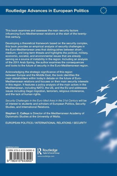 This book examines and assesses the main security factors influencing Euro-Mediterranean relations at the start of the twenty-first century. Developing a theoretical framework based on the security complex, this book provides an empirical analysis of security challenges in the Euro-Mediterranean area that distinguishes between short, medium and long-term threats and highlights the political, military, economic, societal and environmental issues that are already serving as a source of instability in the region. Including analysis of the 2011 Arab Spring, the author examines the consequences and looks to the future of security in the Euro-Mediterranean region. Acknowledging the strategic significance of this region between Europe and the Middle East, the book identifies the main stakeholders within today's debate on the future of Euro-Mediterranean relations and focuses on their main security interests in this region. It features a policy analysis of the main actors in the Mediterranean, including NATO, the United States, and the European Union and addresses issues including illegal migration, terrorism, religious intolerance and the lack of human rights Security Challenges in the Euro-Med Area in the 21st Century be of interest to students and scholars of European Politics, Security Studies and International Relations.