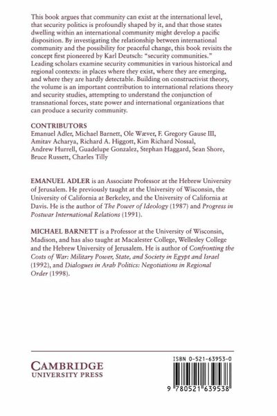 Part I. Introduction and Theoretical Overview: 1. Security communities in theoretical perspective Emanuel Adler and Michael Barnett; 2. A framework for the study of security communities Emanuel Adler and Michael Barnett; Part II. Studies in Security Communities: 3. Insecurity, security, and asecurity in the West European non-war community Ole Waever; 4. Seeds of peaceful change: the OSCE's security community-building model Emanuel Adler; 5. Caravans in opposite directions: society, state and the development of a community in the Gulf Cooperation Council Michael Barnett and Gregory A. Gaus III; 6. Collective identity and conflict resolution in Southeast Asia Amitav Acharya; 7. Australia and the search for security community in the 1990s Richard A. Higgott and Kim Richard Nossal; 8. An emerging security community in South America? Andrew Hurrell; 9. The United States and Mexico: a pluralistic security community Guadelupe Gonzalez and Stephan Haggard; 10. No fences make good neighbours: the development of the US-Canadian security community, 1871-1940 Sean Shore; 11. A neo-Kantian perspective: democracy, interdependence and international organization in building security communities Bruce Russett; Part III. Conclusions: 12. International communities, secure or otherwise Charles Tilly; 13. Studying security communities in theory, comparison, and history Michael Barnett and Emanuel Adler.