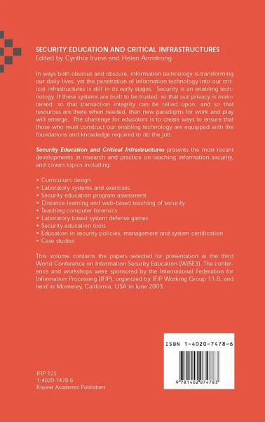 Cyber Security as an Emergent Infrastructure.- Teaching Network Security Through Live Exercises.- Information Warfare in the Trenches.- Changes in the Profile of Security Managers.- A Tutoring System for IT Security.- Design of a Laboratory for Information Security Education.- Integrating Information Security and Intelligence Courses.- Internet Security Management.- Information Security Fundamentals.- Australia's Agenda for E-Security Education and Research.- Is Security a Great Principle of Computing?.- IT Security Readiness in Developing Countries.- A Program for Education in Certification and Accreditation.- Mastering Computer Forensics.- Assembling Competitive Intelligence Using Classroom Scenarios.- Panel: Teaching Undergraduate Information Assurance.- Panel: Teaching Undergraduate Information Assurance.- Panel: Teaching Undergraduate Information Assurance in Russia.- Outcomes-based Assessment as an Assurance Education Tool.- Evaluation Theory and Practice as Applied to Security Education.- Ten Years of Information Security Masters Programmes.- Network Security Scientific and Research Laboratory.- A Comprehensive Undergraduate Information Assurance Program.- Training the Cyber Warrior.- Security Education for Times of Netwar and Peace.- Improving Security Awareness Through Computer-based Training.- Identification and Integration of Information Security Topics.- A Dedicated Undergraduate Track in Computer Security Education.- Index of Keywords.