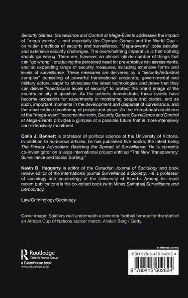 Security Games: Surveillance and Control at Mega-Events addresses the impact of mega-events -- such as the Olympic Games and the World Cup -- on wider practices of security and surveillance. "Mega-Events" pose peculiar and extensive security challenges. The overwhelming imperative is that "nothing should go wrong." There are, however, an almost infinite number of things that can "go wrong"; producing the perceived need for pre-emptive risk assessments, and an expanding range of security measures, including extensive forms and levels of surveillance. These measures are delivered by a "security/industrial complex" consisting of powerful transnational corporate, governmental and military actors, eager to showcase the latest technologies and prove that they can deliver "spectacular levels of security". Mega-events have thus become occasions for experiments in monitoring people and places. And, as such, they have become important moments in the development and dispersal of surveillance, as the infrastructure established for mega-events are often marketed as security solutions for the more routine monitoring of people and place. Mega-events, then, now serve as focal points for the proliferation of security and surveillance. They are microcosms of larger trends and processes, through which -- as the contributors to this volume demonstrate -- we can observe the complex ways that security and surveillance are now implicated in unique confluences of technology, institutional motivations, and public-private security arrangements. As the exceptional conditions of the mega-event become the norm, Security Games: Surveillance and Control at Mega-Events therefore provides the glimpse of a possible future that is more intensively and extensively monitored.