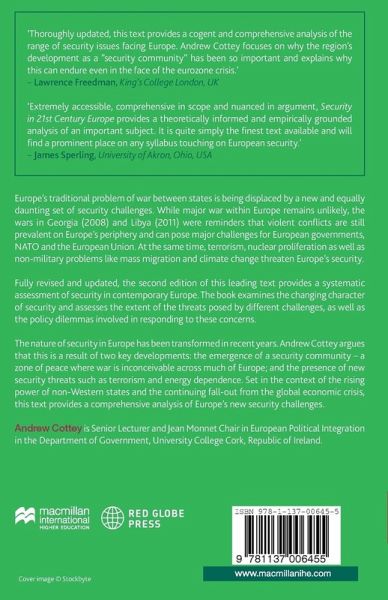 The nature of security in Europe has been transformed in recent years. Andrew Cottey argues that this is a result of two key developments: the emergence of a security community - a zone of peace where war is inconceivable across much of Europe - and the presence of new security threats such as terrorism and energy dependence. Set in the context of the rising power of non-Western states and the continuing fall-out from the global economic crisis, this text provides a comprehensive analysis of Europe's new security challenges.