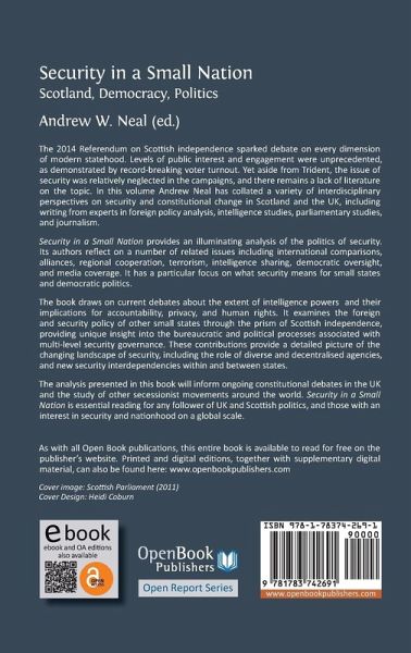 The 2014 Referendum on Scottish independence sparked debate on every dimension of modern statehood. Levels of public interest and engagement were unprecedented, as demonstrated by record-breaking voter turnout. Yet aside from Trident, the issue of security was relatively neglected in the campaigns, and there remains a lack of literature on the topic. In this volume Andrew Neal has collated a variety of interdisciplinary perspectives on security and constitutional change in Scotland and the UK, including writing from experts in foreign policy analysis, intelligence studies, parliamentary studies, and journalism. Security in a Small Nation provides an illuminating analysis of the politics of security. Its authors reflect on a number of related issues including international comparisons, alliances, regional cooperation, terrorism, intelligence sharing, democratic oversight, and media coverage. It has a particular focus on what security means for small states and democratic politics. The book draws on current debates about the extent of intelligence powers and their implications for accountability, privacy, and human rights. It examines the foreign and security policy of other small states through the prism of Scottish independence, providing unique insight into the bureaucratic and political processes associated with multi-level security governance. These contributions provide a detailed picture of the changing landscape of security, including the role of diverse and decentralised agencies, and new security interdependencies within and between states. The analysis presented in this book will inform ongoing constitutional debates in the UK and the study of other secessionist movements around the world. Security in a Small Nation is essential reading for any follower of UK and Scottish politics, and those with an interest in security and nationhood on a global scale.
