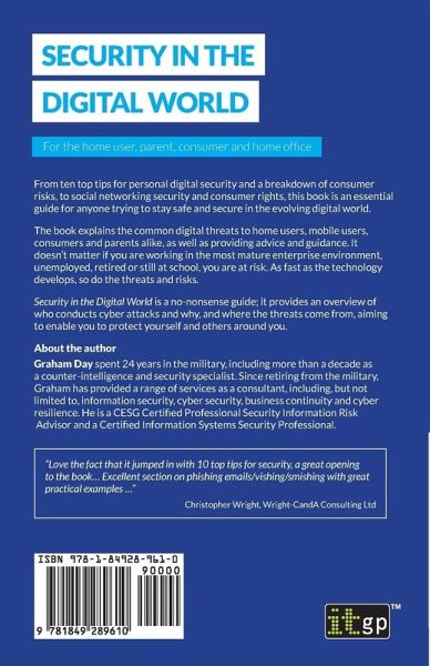 "Love the fact that it jumped in with 10 top tips for security, a great opening to the book… Excellent section on phishing emails/vishing/smishing, with great practical examples …" Christopher Wright, Wright-CandA Consulting Ltd Protect yourself from cyber threats and risks Cyberspace, the Internet, computer networks, the digital world – call it what you will – is always developing. And so are the threats and risks of being online. Security in the Digital World explains the common digital threats to home users, home offices, mobile users, consumers and parents alike, as well as providing tips, advice and guidance. It doesn’t matter if you are working in the most mature enterprise environment, unemployed, retired or still at school, whether you often have a smartphone in your hand or only use an e-reader, you are at risk. Security in the Digital World is a straightforward guide for the home user, parent, consumer and home office, providing a fountain of knowledge for modern security needs. It gives an overview of who conducts cyber attacks any why, and where cyber threats come from. It also explains what you can do to protect yourself and others, and provides a personal cyber security risk assessment. Deeper insight into threats in the digital world This must-have guide gives up-to-date information on consumer risks and provides: Ten tips to keep your digital information secure; Understanding and awareness of information security and cyber threats; Explanations of what social engineering is and techniques used by cyber criminals; Advice on what to look out for online and your rights as a consumer; and Guidance on common threats in the digital age, including malware, social engineering and ransomware. There is little technical knowledge or skill needed to understand and apply the book’s tips and advice, and there are lots of images to help guide you. From the top ten tips and the breakdown of consumer risks, to social networking and parental security, this book is an essential guide for anyone and everyone trying to stay safe and secure in the evolving digital world. About the author Graham Day spent 24 years in the military, including more than a decade as a counter-intelligence and security specialist on operational deployments around the world. Since retiring from the military, Graham has provided a range of services as a consultant, including, but not limited to, information security, cyber security , business continuity, cyber risk and cyber resilience. He is a CESG Certified Professional Security Information Risk Advisor, a Certified Information Systems Security Professional, and a member of the Author Group for British Standard 31111 Cyber Risk & Resilience.