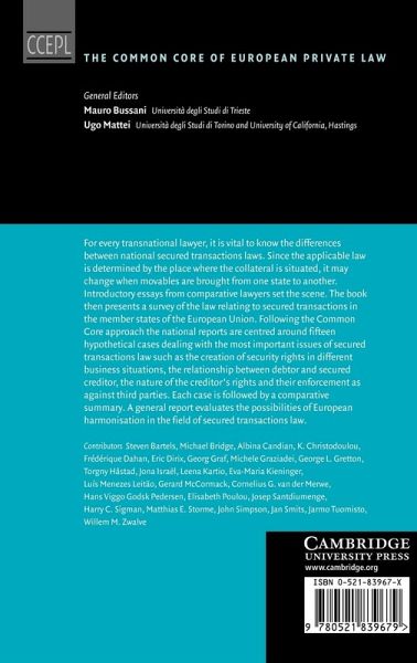 For every transnational lawyer, it is vital to know the differences among national secured transactions law. Since the applicable law is determined by the place where the collateral is situated, it may change when movables are brought from one state to another. Introductory chapters from comparative lawyers set the scene for this topic. The book presents a survey of the law relating to secured transactions in all member states of the European Union. Following the Common Core Approach the national reports are centred around 15 hypotheticals dealing with the most important issues of secured transactions law such as the creation of security rights in different business situations, the relationship between debtor and secured creditor, the nature of the creditor's rights and their enforcement as against third parties. Each case is followed by a comparative summary. A general report evaluates the possibilities of European harmonisation in the field of secured transactions.