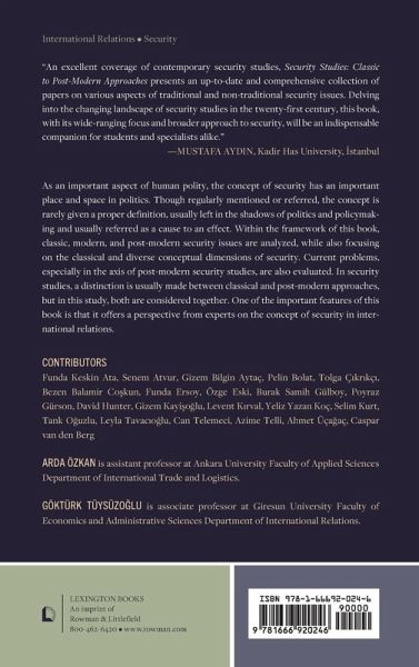 Introduction to Security by Burak Samih Gülboy Chapter 1: Military Security: War and Transformation by A. Poyraz Gürson and Can Telemeci Chapter 2: Political Security: As An Expanding and Transforming Concept by Göktürk Tüysüzoglu Chapter 3: Societal Security: A New Approach to Security in the Post-Cold War World by Bezen Balamir Coskun and Ahmet Üçagaç Chapter 4: Economic Security: Increasing Impact of Economic Factors on International Security by Selim Kurt Chapter 5: Environmental Security: A New Dimension of Security Studies by Arda Özkan and David Hunter Chapter 6: Energy and Security: Evolution of the Energy Security Concept: New Dimensions and Challenges by Azime Telli Chapter 7: Cyber Security: General Perspectives on Cyber Security by Pelin Bolat and Gizem Kayisoglu Chapter 8: Urban Security: Integration of the Local into Security Studies by Senem Atvur and Asiye Gün Günes Günal Chapter 9: Maritime Security: Law and Order in the Seas by Levent Kirval and Sezer Ilgin Chapter 10: Food Secu