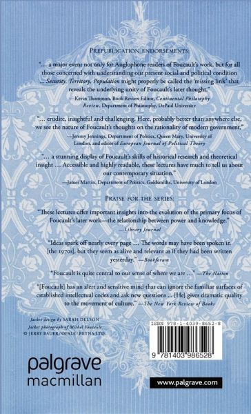 This book derives from Foucault's lectures at the College de France between January and April 1978, which can be seen as a radical turning point in his thought. Focusing on 'bio-power', he studies the foundations of this new technology of power over population and explores the technologies of security and the history of 'governmentality'.