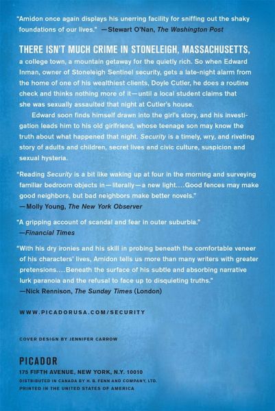 There isn't much crime in Stoneleigh, Massachusetts, a college town, a mountain getaway for the quietly rich. So when Edward Inman, owner of Stoneleigh Sentinel security, gets a late-night alarm from the home of one of his wealthiest clients, Doyle Cutler, he does a routine check and thinks nothing more of it-until a local student claims that she was sexually assaulted that night at Cutler's house. Edward soon finds himself drawn into the girl's story, and his investigation leads him to his old girlfriend, whose teenage son may know the truth about what happened that night. Security is a timely, wry, and riveting story of adults and children, secret lives and civic culture, suspicion and sexual hysteria.