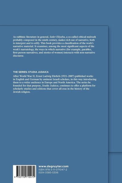 The book is concerned with a so called ethical midrash, Seder Eliyahu (also known as Tanna debe Eliyahu), a post-talmudic work probably composed in the ninth century. It provides a survey of the research on this late midrash followed by five studies of different aspects related to what is designated as the work's narratology. These include a discussion of the problem of the apparent pseudo-epigraphy of the work and of the multiple voices of the text; a description of the various narrative types which the work, itself as a whole of non-narrative character, makes use of; a detailed treatment of Seder Eliyahu's parables and most characteristic first person narratives (an extremely unusual form of narrative discourse in rabbinic literature); as well as a final chapter dedicated to selected women stories in this late midrash. As it emerges from the survey in chapter 1 such a narratologically informed study of Seder Eliyahu represents a new approach in the research on a work that is clearly the product of a time of transition in Jewish literature.