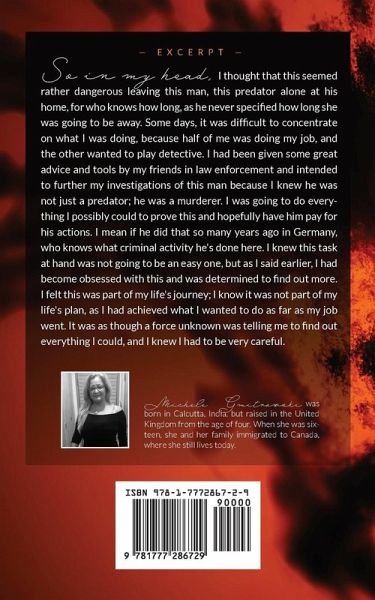 So in my head, I thought that this seemed rather dangerous leaving this man, this predator alone at his home, for who knows how long, as he never specified how long she was going to be away. Some days, it was difficult to concentrate on what I was doing, because half of me was doing my job, and the other wanted to play detective. I had been given some great advice and tools by my friends in law enforcement and intended to further my investigations of this man because I knew he was not just a predator; he was a murderer. I was going to do everything I possibly could to prove this and hopefully have him pay for his actions. I mean if he did that so many years ago in Germany, who knows what criminal activity he's done here. I knew this task at hand was not going to be an easy one, but as I said earlier, I had become obsessed with this and was determined to find out more. I felt this was part of my life's journey; I know it was not part of my life's plan, as I had achieved what I wanted to do as far as my job went. It was as though a force unknown was telling me to find out everything I could, and I knew I had to be very careful.