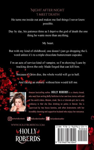 Night after night, I meet Death He turns me inside out and makes me feel things I never knew possible. Day by day, his patience thins as I deprive the god of death the one thing he wants more than anything. My heart. But with my kind of childhood, one doesn't just go dropping the L word unless it's to a triple chocolate buttercream cupcake. I'm an acts of service kind of vampire, so I'm showing I care by tracking down the only blade forged that can kill him. Because if Grim dies, the whole world will go to hell. And facing an eternity without him would kill me. Download NOW if you don't want to miss the epic conclusion to this steamy, action-packed trilogy. This is the FINAL book in slow burn series that goes full inferno. DO NOT skip the first two books. That's a good girl...