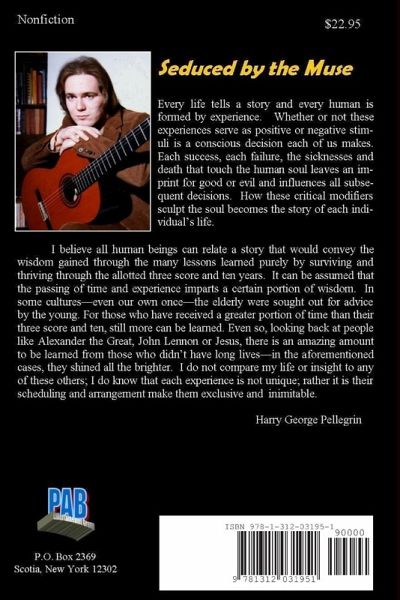 Music: Is it a hobby? Is it a pastime? Is it an ego boost? Is it an obsession? Only if it is an all-consuming obsession should one consider music as a career. Someone once said "If anything can discourage you from being a musician, let it!" Seduced by the Muse is the biography of a professional musician highlighting how life's experiences--death, injury, sickness, ridicule and praise--shaped a relatively successful career. Music is life to the musician and every incident, emotion and trial form the core of how that musician interprets his world and this interpretation is clearly apparent in every note played. The observations of classical guitarist Harry George Pellegrin. [Contains detailed descriptions of paranormal events as well as experiences with a religious cult.]