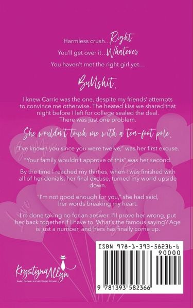 Harmless crush...Right You'll get over it...Whatever You haven't met the right girl yet... Bull***t. I knew Carrie was the one, despite my friends' attempts to convince me otherwise. The heated kiss we shared that night before I left for college sealed the deal. There was just one problem. She wouldn't touch me with a ten-foot pole. "I've known you since you were twelve," was her first excuse. "Your family wouldn't approve of this," was her second. By the time I reached my thirties, when I was finished with all of her denials, her final excuse, turned my world upside down. "I'm not good enough for you," she had said, her words breaking my heart. I'm done taking no for an answer. I'll prove her wrong, put her back together if I have to. What's the famous saying? Age is just a number, and hers has finally come up.