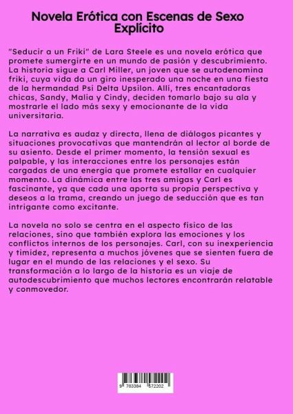 "Seducir a un Friki" de Lara Steele es una novela erótica que promete sumergirte en un mundo de pasión y descubrimiento. La historia sigue a Carl Miller, un joven que se autodenomina friki, cuya vida da un giro inesperado una noche en una fiesta de la hermandad Psi Delta Upsilon. Allí, tres encantadoras chicas, Sandy, Malia y Cindy, deciden tomarlo bajo su ala y mostrarle el lado más sexy y emocionante de la vida universitaria.La narrativa es audaz y directa, llena de diálogos picantes y situaciones provocativas que mantendrán al lector al borde de su asiento. Desde el primer momento, la tensión sexual es palpable, y las interacciones entre los personajes están cargadas de una energía que promete estallar en cualquier momento. La dinámica entre las tres amigas y Carl es fascinante, ya que cada una aporta su propia perspectiva y deseos a la trama, creando un juego de seducción que es tan intrigante como excitante.La novela no solo se centra en el aspecto físico de las relaciones, sino que también explora las emociones y los conflictos internos de los personajes. Carl, con su inexperiencia y timidez, representa a muchos jóvenes que se sienten fuera de lugar en el mundo de las relaciones y el sexo. Su transformación a lo largo de la historia es un viaje de autodescubrimiento que muchos lectores encontrarán relatable y conmovedor."Seducir a un Friki" es una lectura ideal para aquellos que buscan una historia erótica con un toque de humor y personajes bien desarrollados. La combinación de escenas explícitas y una trama envolvente hace que esta novela sea una opción perfecta para los amantes del género erótico que desean algo más que simplemente excitación. La prosa de Lara Steele es fluida y cautivadora, haciendo que cada página sea una delicia para leer.