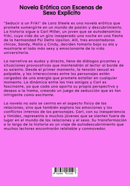 "Seducir a un Friki" de Lara Steele es una novela erótica que promete sumergirte en un mundo de pasión y descubrimiento. La historia sigue a Carl Miller, un joven que se autodenomina friki, cuya vida da un giro inesperado una noche en una fiesta de la hermandad Psi Delta Upsilon. Allí, tres encantadoras chicas, Sandy, Malia y Cindy, deciden tomarlo bajo su ala y mostrarle el lado más sexy y emocionante de la vida universitaria.La narrativa es audaz y directa, llena de diálogos picantes y situaciones provocativas que mantendrán al lector al borde de su asiento. Desde el primer momento, la tensión sexual es palpable, y las interacciones entre los personajes están cargadas de una energía que promete estallar en cualquier momento. La dinámica entre las tres amigas y Carl es fascinante, ya que cada una aporta su propia perspectiva y deseos a la trama, creando un juego de seducción que es tan intrigante como excitante.La novela no solo se centra en el aspecto físico de las relaciones, sino que también explora las emociones y los conflictos internos de los personajes. Carl, con su inexperiencia y timidez, representa a muchos jóvenes que se sienten fuera de lugar en el mundo de las relaciones y el sexo. Su transformación a lo largo de la historia es un viaje de autodescubrimiento que muchos lectores encontrarán relatable y conmovedor."Seducir a un Friki" es una lectura ideal para aquellos que buscan una historia erótica con un toque de humor y personajes bien desarrollados. La combinación de escenas explícitas y una trama envolvente hace que esta novela sea una opción perfecta para los amantes del género erótico que desean algo más que simplemente excitación. La prosa de Lara Steele es fluida y cautivadora, haciendo que cada página sea una delicia para leer.