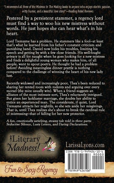 For Jane Austen fans who always wished her stories had a bit more heat. Pestered by a persistent stammer, a regency lord with a keen interest in orreries and boxing-but not in talking-must find a way to woo his new mistress without words. He just hopes she can hear what's in his heart. Recently widowed and increasingly poor, Thea's been reduced to sharing her rented room with rodents and arguing over every morsel (the mice usually win). When a friend suggests an alliance of the most intimate sort, Thea's reluctantly intrigued. But given her lackluster marriage, she doubts her ability to entice an experienced man. The considerate, if quiet, Lord Tremayne attracts her mightily, so she sets aside her misgivings. That is, until Thea realizes she's about to break the cardinal rule of mistressing-that of falling for her new protector.The Mistress in the Making steamy Regency series is a fun and sexy, emotionally satisfying tale told in three parts: Seductive Silence, Lusty Letters, and Daring Declarations.¿¿