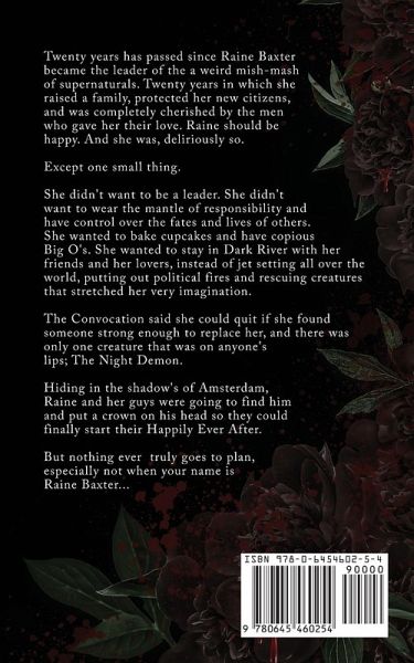 Twenty years has passed since Raine Baxter became the leader of the a weird mish-mash of supernaturals. Twenty years in which she raised a family, protected her new citizens, and was completely cherished by the men who gave her their love. Raine should be happy. And she was, deliriously so. Except one small thing. She didn't want to be a leader. She didn't want to wear the mantle of responsibility and have control over the fates and lives of others. She wanted to bake cupcakes and have copious Big O's. She wanted to stay in Dark River with her friends and her lovers, instead of jet setting all over the world, putting out political fires and rescuing creatures that stretched her very imagination. The Convocation said she could quit if she found someone strong enough to replace her, and there was only one creature that was on anyone's lips; The Night Demon. Hiding in the shadow's of Amsterdam, Raine and her guys were going to find him and put a crown on his head so they could finally start their Happily Ever After. But nothing ever truly goes to plan, especially not when your name is Raine Baxter...