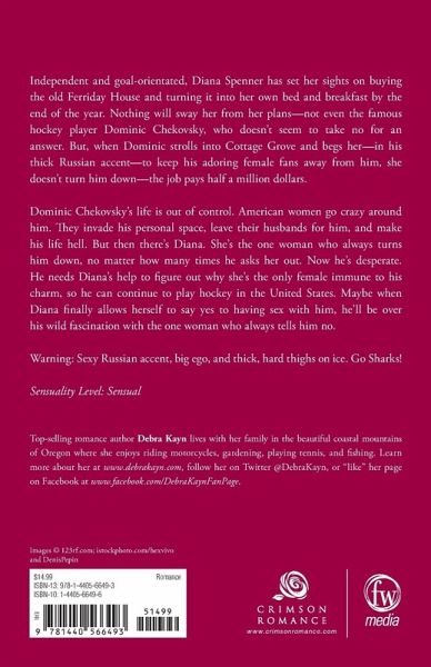 Independent and goal orientated, Diana Spenner has set her sights on buying the old Ferriday House and running her own bed and breakfast by the end of the year. Nothing will sway her from her plans, especially the famous hockey player Dominic Chekovsky, who can't take no for an answer. But, when Dominic strolls into Cottage Grove and begs her in his thick Russian accent to keep his adoring female fans away from him, she's not going to turn him down-because the job pays half a million dollars. Dominic Chekovsky's life is out of control. American women go crazy around him. They invade his personal space, leave their husbands for him, and make his life hell. Except, Diana. She's the one woman who always turns him down, no matter how many times he asks her out on a date. Now he's desperate. He needs Diana's help to figure out why she's the only female immune to his charm, so he can continue to play hockey in the United States. Maybe when Diana finally allows herself to say yes to having sex with him, he'll be over his wild fascination with the one woman who always tells him no. Warning: Sexy Russian accent, big ego, and thick, hard thighs on ice. Go Sharks! Sensuality Level: Sensual